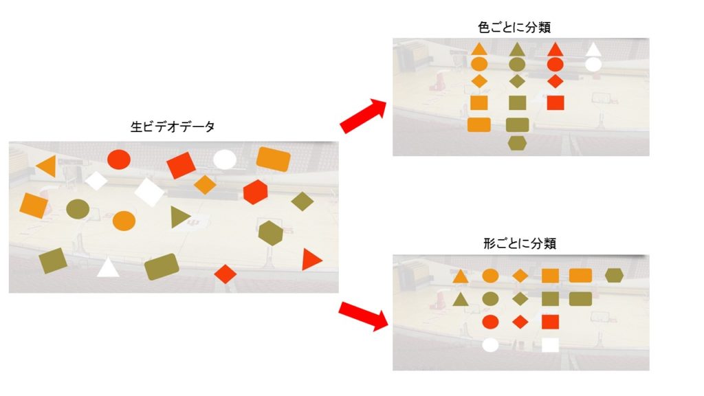 映像分析でできること そして映像分析とは何なのか? この本質的部分に関して、シンプルに理解するには図1のようなイメージがわかりやすいと思います。左側の図が、1試合を通しで撮影した生ビデオです。種々雑多な情報が入り混じっている状態です。映像分析のフィルターにかけることによって、例えば色分けしたデータに置き換わります(右上の図)。別のフィルターをかけると、形ごとに分かれます(右下の図)。分析ソフトのこのような機能を活かしつつ、チームやコーチの考え方に合わせて、いろいろな分類方法・分析方法を用いていくことが大切だと思います。