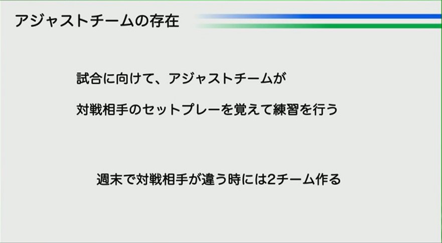 試合に向けての準備でとても重視しているのが、アジャストチームの設定と練習だ。対戦相手の傾向が分析できたら、チーム内で相手を模したアジャストチームをつくり、相手のセットプレーを覚えて自チームとの対戦形式で練習を行う。
