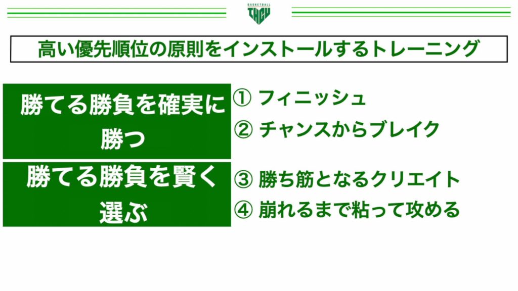 これを選手に説明した上で、「1.フィニッシュ、2.チャンスからブレイク」の2項目を徹底的に練習する。一定の成果を得たら、「3.勝ち筋となるクリエイト、4.崩れるまで粘って攻める」の練習に進む。